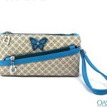 Check out this white and grey checkered hand purse which is perfect for a sunny day out or a fun evening. The bright blue highlights, the butterfly logo and the heart-shaped chains collectively give this bag a charming feminine touch and also adds a bit of bling to it. The white and grey checkered pattern keeps the look from being overly gaudy. There are multiple zip-closure compartments that gives enough space to store your essentials even if you are out the entire day.