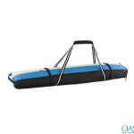 The very outstanding collection of designer sports bags includes the attractive tricolor spread ski bag. The snider tray like structure of the trendy ski bag comes with a super textured base case in all black. The top panel that forms the cover comes with a tricolor horizontal panel with white black and blue panels as the attractive base. The interior lining in superior quality provides excess space for storage of all ski gear and other essentials. The sleek long side handles in black and white compliment the black banded belts and piping provided across either side.